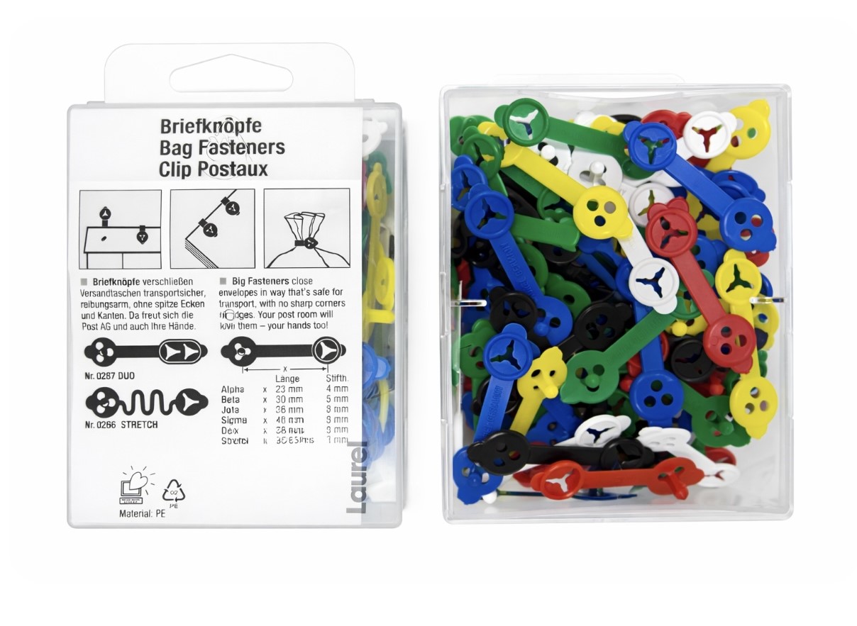 Die Laurel Briefknöpfe sind universell einsetzbar als kleine nützliche Helfer in Büro, Haushalt, Garten oder Werkstatt. Sie bündeln und heften Schriftstücke und Broschüren. Die Laurel Briefknöpfe eignen sich perfekt als postgenehmigter, transportsicherer Verschluss von Musterbeuteln oder Versandtaschen. Luftpolsterumschläge können mit ihnen einfach und originell zugehalten werden. Auch in der Küche machen die Briefknöpfe eine gute Figur und verschließen Gefrierbeutel sicher und zuverlässig und sind immer wieder zu verwenden. Die abgerundeten Ecken und Kanten des Briefknopfes gewährleistet, dass es zu keinerlei Beschädigungen kommt. Das zähe und flexible Material hält fest und dauerhaft. Produktdetails: 100% „Made in Germany“, aus sortenreinem Polyethylen (PE). Größe: 30 x 5 mm (L x H). Die Laurel Briefknöpfe