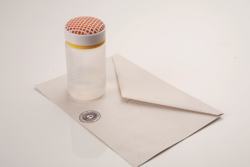 – befeuchtet Umschläge, Briefmarken.