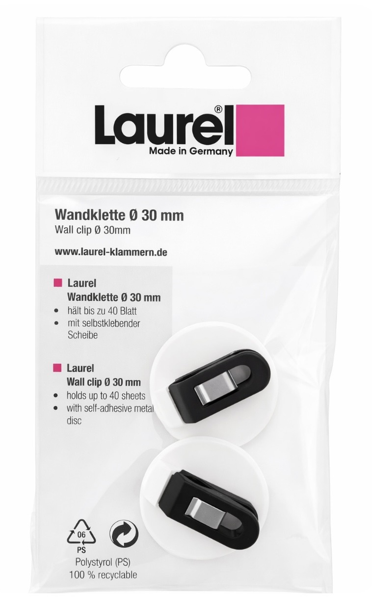 Die praktische Wandklette ist eine selbstklebende, weiße Scheibe mit dem Pegy Halteklip. Durch die selbstklebende Scheibe lässt sich die Wandklette schnell und einfach anbringen. Dabei hält sie mühelos Notizen, Pläne, Karten und Unterlagen bis zu 55 Blatt. Produktdetails: 100% „Made in Germany“, Material Polystyrol (PS). Größe: ∅ 30 mm. Die Laurel Klammern bieten vielseitige Einsatzmöglichkeiten in Büro und Haushalt. sind funktionell und strapazierfähig. fixieren Krawatten, Schlüssel, Kabel, Notizen etc. halten an Wand, magnetischen Flächen, Kleiderstange etc.